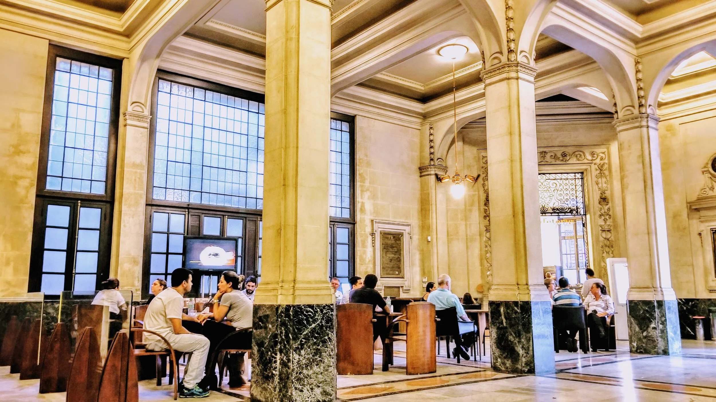 the cafe bolsa trading circle restricted seating for 81 powerful trading members. growers employed brokers to obtain access to daily trade activity. the palatial edifice features finest materials like multi-colored intricately-laced polished marbled floors.